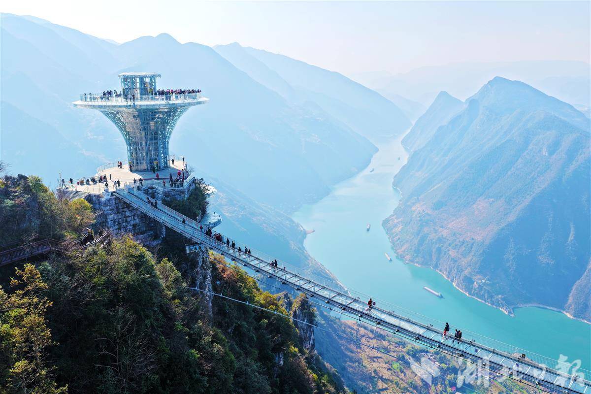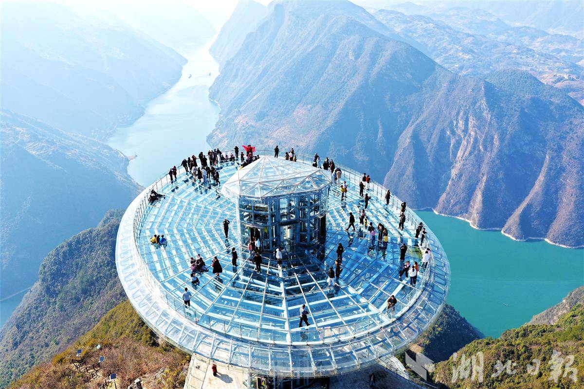 2月19日,游客在巴东县巫峡口景区的玻璃栈道上游玩。