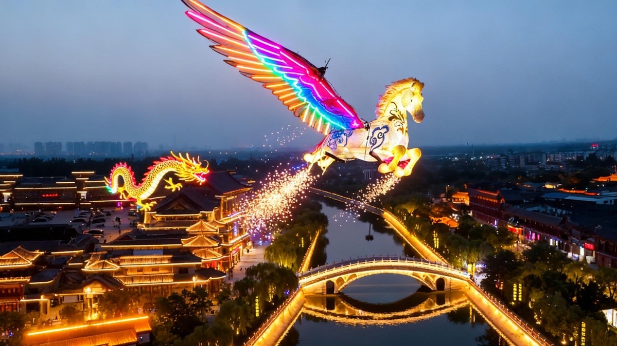 After dark, Yangliuqing transforms into a dazzling winter wonderland. The Spring Festival light shows highlight both aerial and stage performances, blending dance, drumming and traditional elements of the woodblock New Year prints into an electrifying celebration. Don’t miss the Dragon Horse Flying show, where legendary creatures from Chinese prints soar across the night sky using cutting-edge technology — a visual feast perfect for photos and videos.