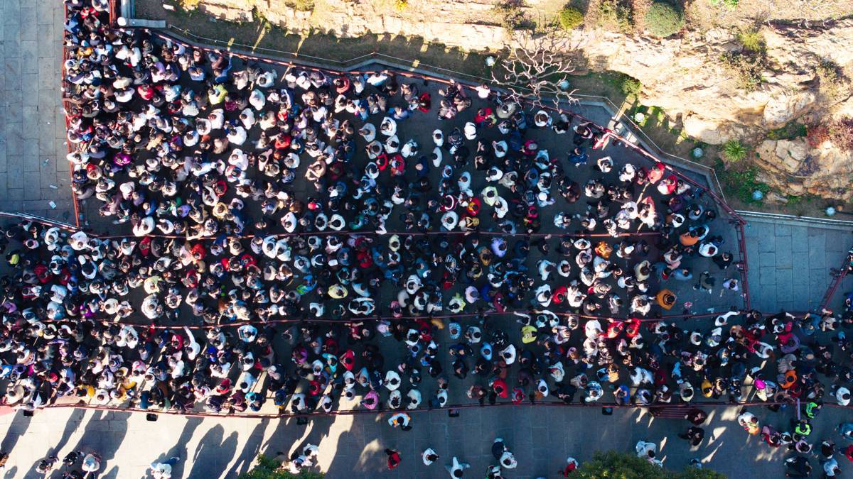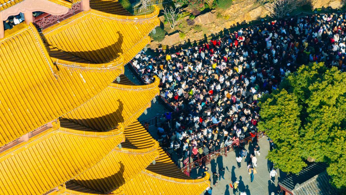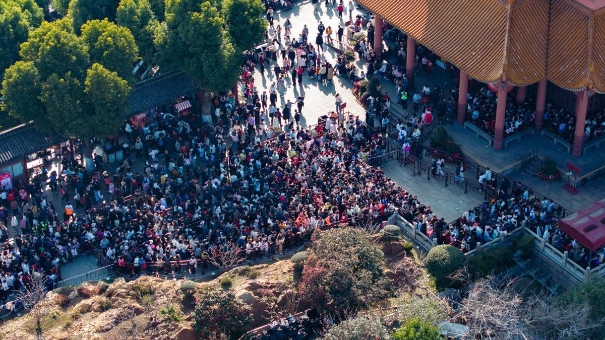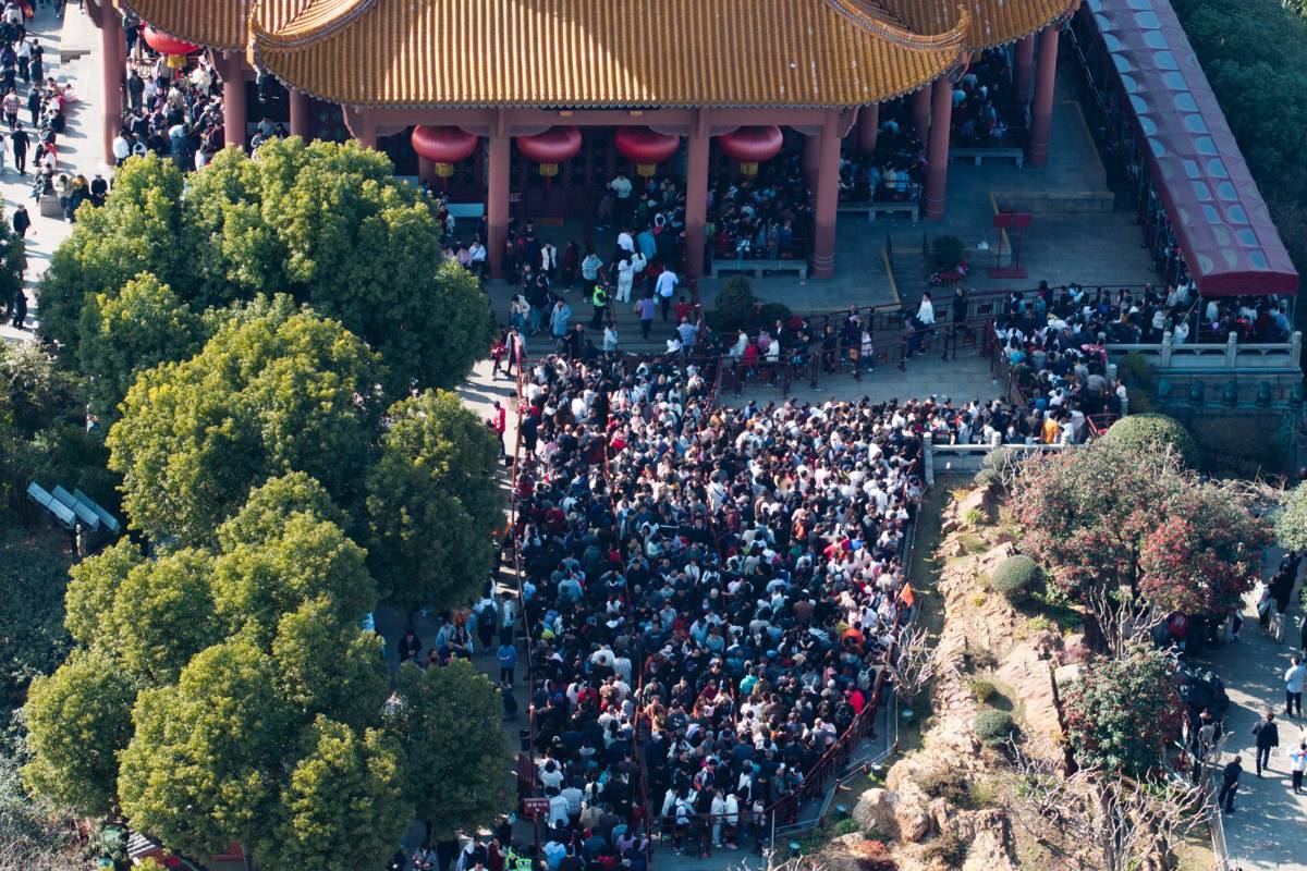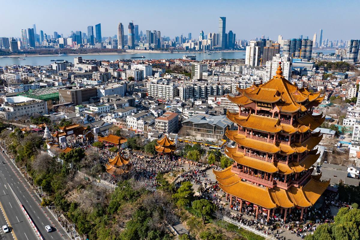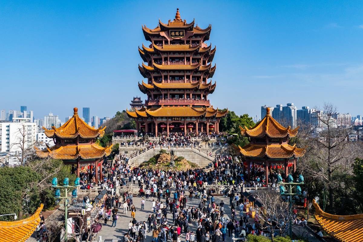 2026年2月20日,大年初四,武汉黄鹤楼公园内人流如织,大批游客有序排起长队等候登楼,一览武汉三镇的大美风光。(湖北日报全媒记者 何宇欣 摄)