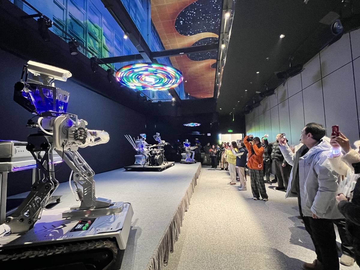 场馆内,有首次在武汉亮相的春晚同款魔法原子机器人,为游客娓娓道来武汉的各种文旅知识;曾五次登陆央视、国内少有的整套乐队机器人,在现场奏响电音热浪;还有曾和王力宏同台演出的跳舞机器人,以及机器狗、四轮机器人以及会后空翻、能精准射箭的各类机器人齐聚一堂,游客皆可亲身体验。“这阵容,堪比机器人界春晚。”胡伟感叹。