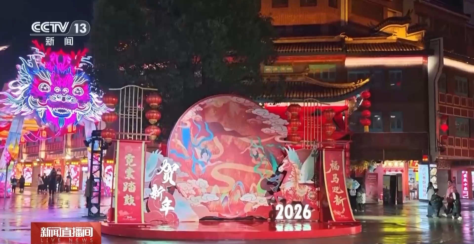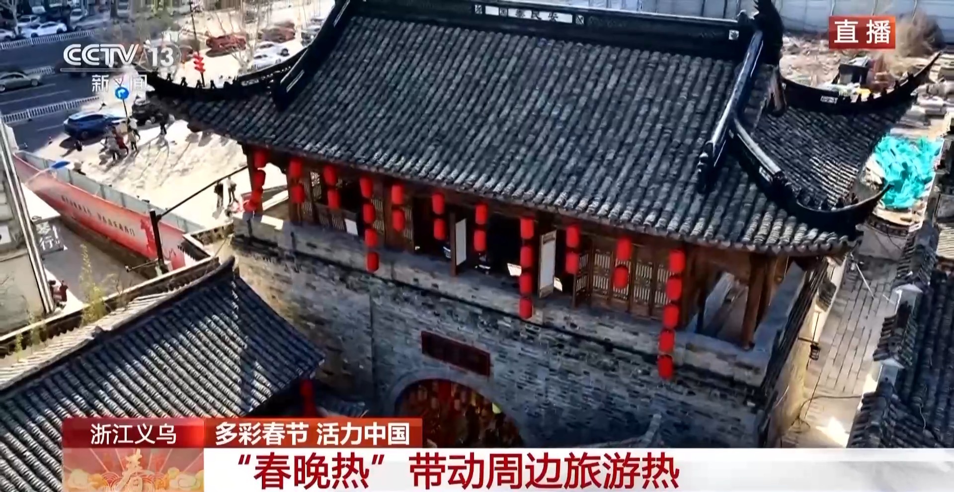 回到现场,我所站的位置,就是大家看到的成龙接过鸡毛的那个地方。我的身后就是西门老街的迎恩门,无论是屋檐还是灯笼还是年味的布置,都原汁原味保留了春晚同款街区的味道。