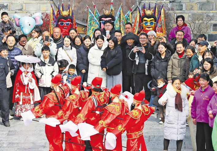 2月18日,钟祥市莫愁村热闹非凡,海马舞、拉犟驴、蚌精戏渔夫等非遗民俗展演与汉服体验活动轮番上演。浓郁的年味吸引众多游客近距离领略民俗的独特魅力。 (视界网 赵平 摄)