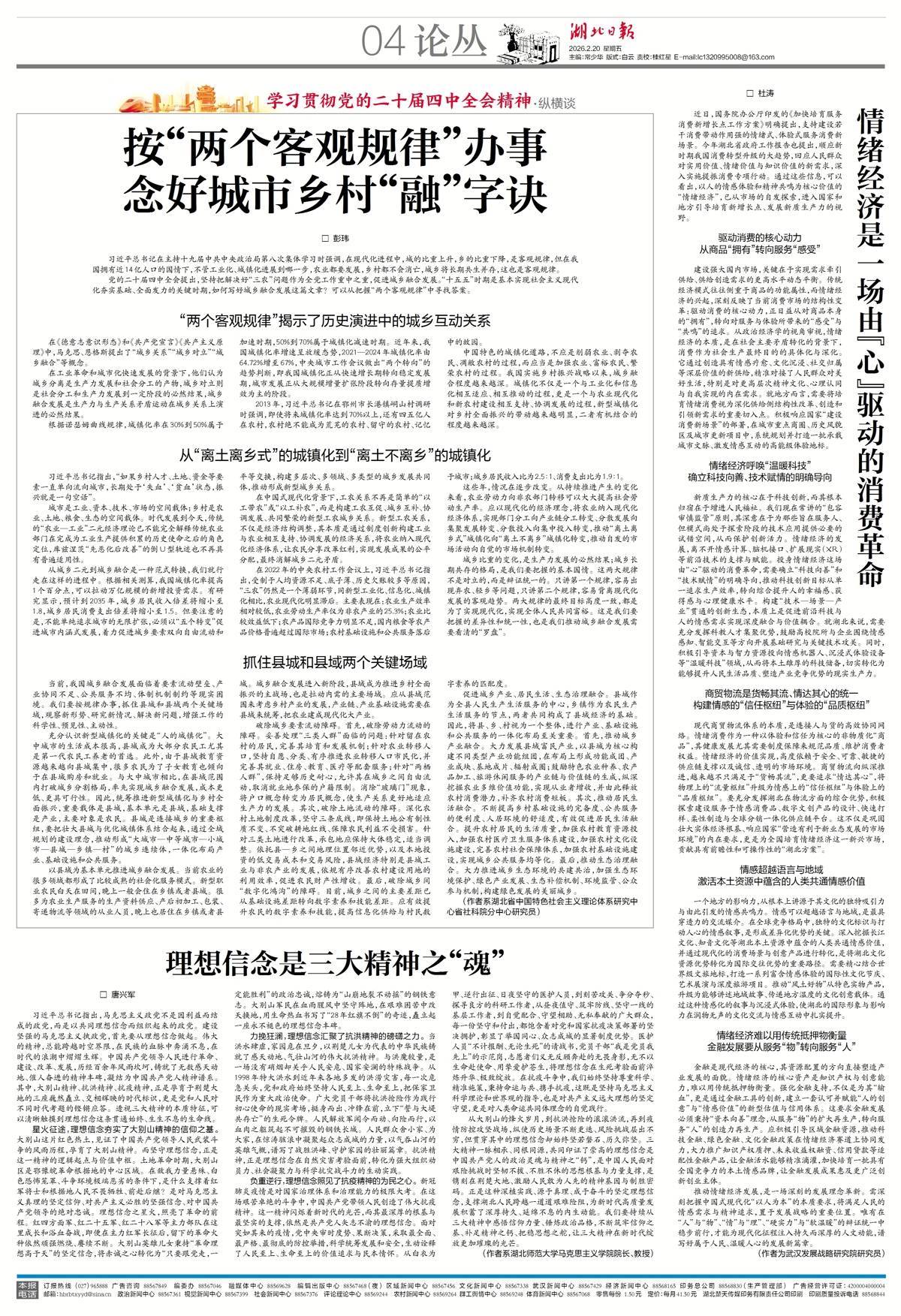 促进城乡产业、居民生活、生态治理融合。县城作为全县人民生产生活服务的中心,乡镇作为农民生产生活服务的节点,两者共同构成了县域经济的基础。因此,将县、乡、村视为一个整体,进行产业、基础设施和公共服务的一体化布局至关重要。首先,推动城乡产业融合。大力发展县域富民产业,以县城为核心构建不同类型产业功能组团,在布局上形成功能成团、产业成块、基地成片、辐射成圈;鼓励特色农业种养、农产品加工、旅游休闲服务的产业链与价值链的生成,纵深挖掘农业多维价值功能,实现从业者增收,并由此释放农村消费潜力,补齐农村消费短板。其次,推动居民生活融合。不断提高乡村基础设施的完备度、公共服务的便利度、人居环境的舒适度,有效促进居民生活融合。提升农村居民的生活质量,加强农村教育资源投入,加强农村医疗卫生服务体系建设,加强农村文化设施建设,完善农村社会保障体系,加强农村基础设施建设,实现城乡公共服务均等化。最后,推动生态治理融合。大力推进城乡生态环境的共建共治,加强生态环境保护、绿色产业发展、生态补偿机制、环境监管、公众参与机制,构建绿色发展的美丽城乡。(作者系湖北省中国特色社会主义理论体系研究中心省社科院分中心研究员)