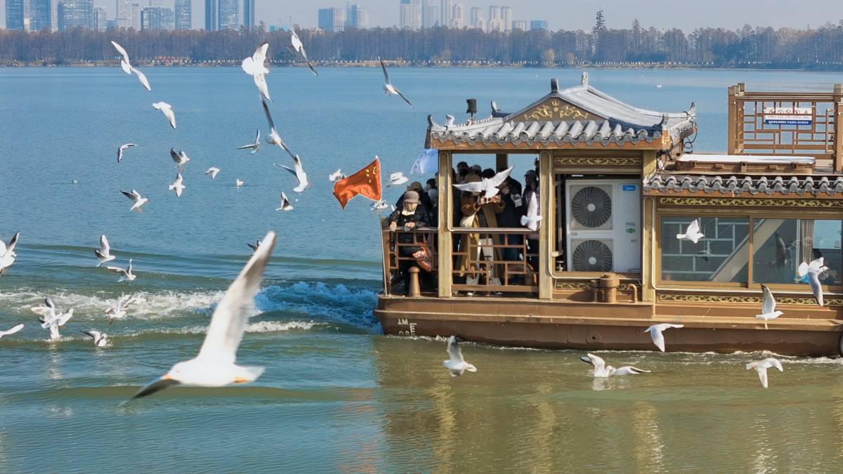 据介绍,春日的信号已至,红嘴鸥们即将整理羽翼,于2月底起分批迁徙,3月基本全部启程,告别东湖。近一周是最后观赏窗口期,晴朗有风时段鸥群最为活跃。在游船二层甲板上,游客汪先生举着相机不断调整角度,镜头里红嘴鸥掠过湖面的身影与远处的“东湖之眼”相映成趣。“以前只在海边见过海鸥,没想到在内陆武汉能有这样的体验!”他兴奋地分享,自己是刷到社交平台上海鸥伴飞游船的视频专程而来,“它们一点都不怕人,最近的时候都能看到它们的肚子,红嘴白翅在阳光下太治愈了”。