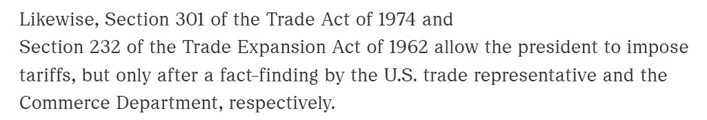 同样,《1974年贸易法》第301条或《1962年贸易扩张法》第232条也赋予总统加征关税的权力,但需分别经美国贸易代表办公室和商务部进行事实调查后方可实施。