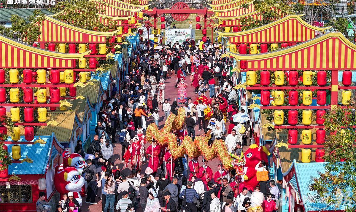 2月21日,武汉花博汇上演龙腾盛世大巡游民俗活动,热闹非凡。精彩的巡游表演吸引众多游客观看体验,大家在浓郁的民俗氛围中欢度假日,感受新春喜庆气息。(湖北日报全媒记者 薛婷 通讯员 黄婷 摄)