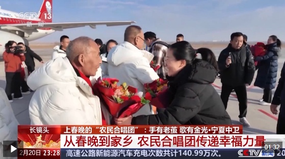 2月18日,宁夏中卫市中宁县大战场镇农民合唱团载誉返乡。从机场到镇区,乡亲们敲锣打鼓、舞龙舞狮,迎接自家的“明星”回家。