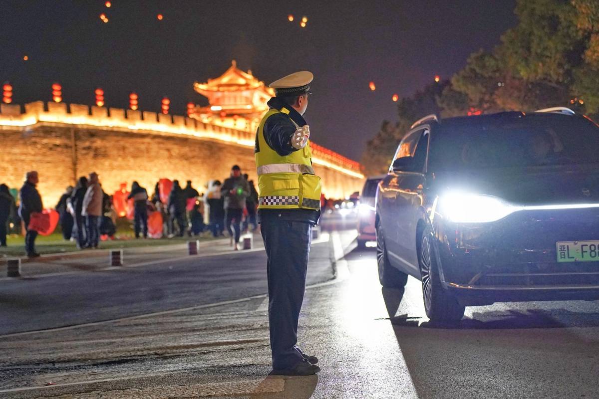 襄阳古城外,交警夜间执勤。通讯员梁政 供图