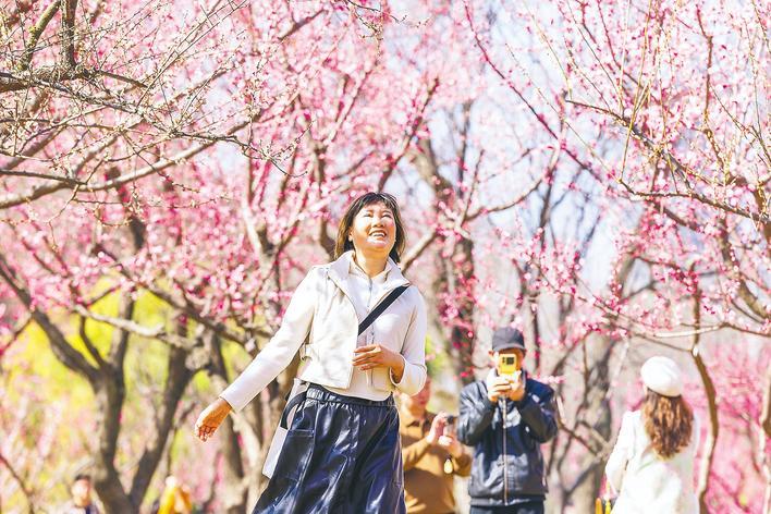 作为武汉赏花主阵地,东湖梅园在这个春节人气爆棚。园内2万余株、360余种梅花正值最佳赏花期,粉若丹霞、白似凝雪,汇成一片花海。身着汉服的游客梅下留影,阖家出动的市民漫步赏梅,尽享团圆温馨时光。据统计,正月初一至初三,东湖梅园累计接待游客2.68万人,较去年同期大幅增长45.6%。