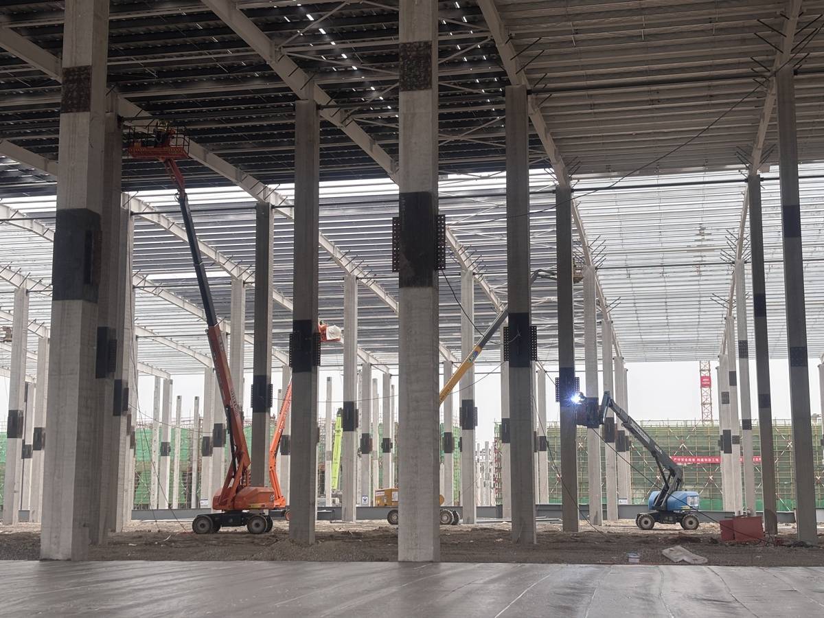 2月15日,楚能襄阳基地上,工人们正在喷涂防火材料。(湖北日报全媒记者吴宇睿 摄)