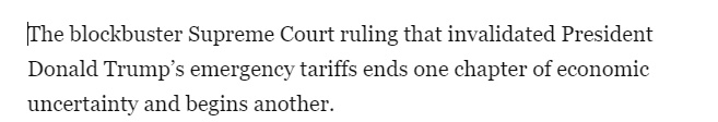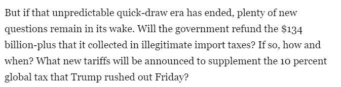 最高法院的这项裁决终结了一年多来总统“自由行事”的局面。但随之而来的还有许多新问题。政府是否会退还其非法征收的超过1340亿美元的进口税?如果会,将如何退还?何时退还?除了新推出的加征全球关税之外,还会宣布哪些新的关税措施?