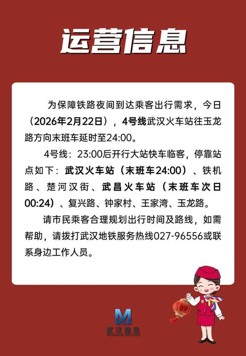 湖北日报讯(记者黄洁如、通讯员李丹、产启斗)为保障铁路夜间到达乘客出行需求,今日(2月22日),武汉地铁4号线武汉火车站往玉龙路方向末班车延时至24:00。