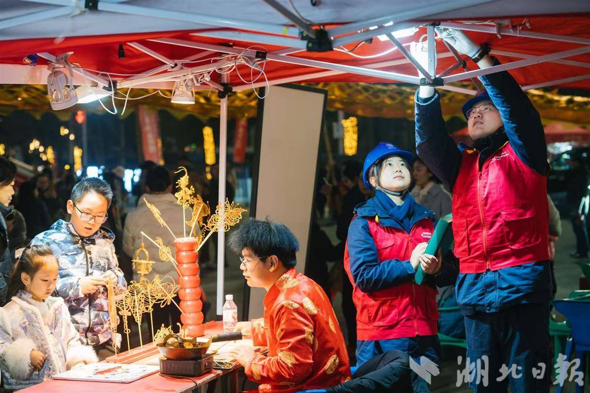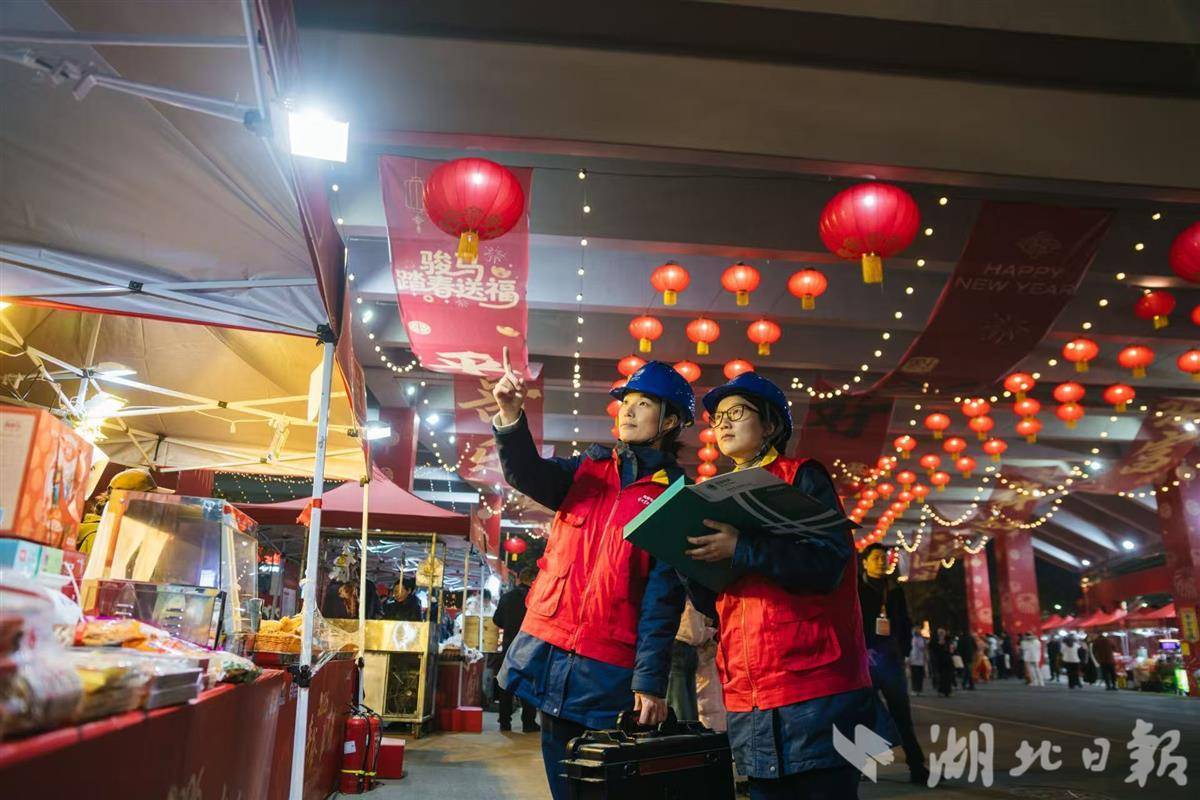 就在这热闹背后几步远的地方,几个身着深蓝色工装的身影正穿过人流,走向广场东侧的配电箱。他们的肩上挎着工具包,手里握着红外测温仪——他们是国网武汉供电公司运维人员,也是这场年货节幕后的“电力守护者”。
