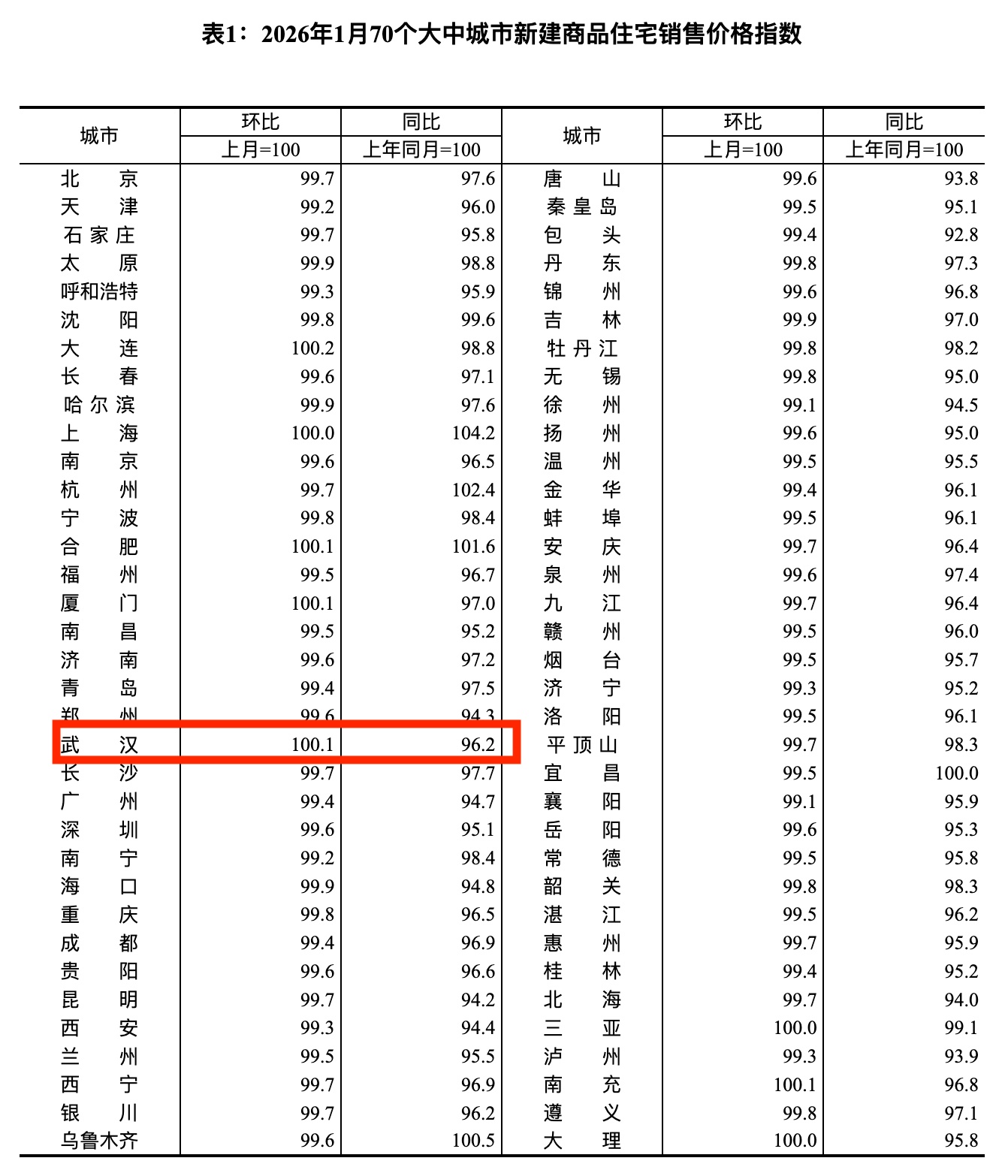 2026年1月份数据显示,武汉新房房价环比上涨0.1%。(图源国家统计局官网)