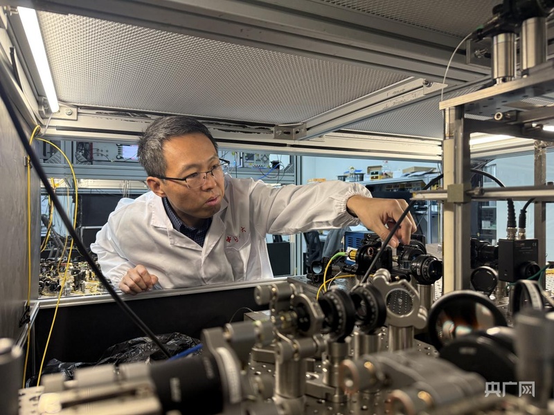 中国科学技术大学教授包小辉正在优化单原子的荧光信号收集(央广网记者 鲍玉婵摄)