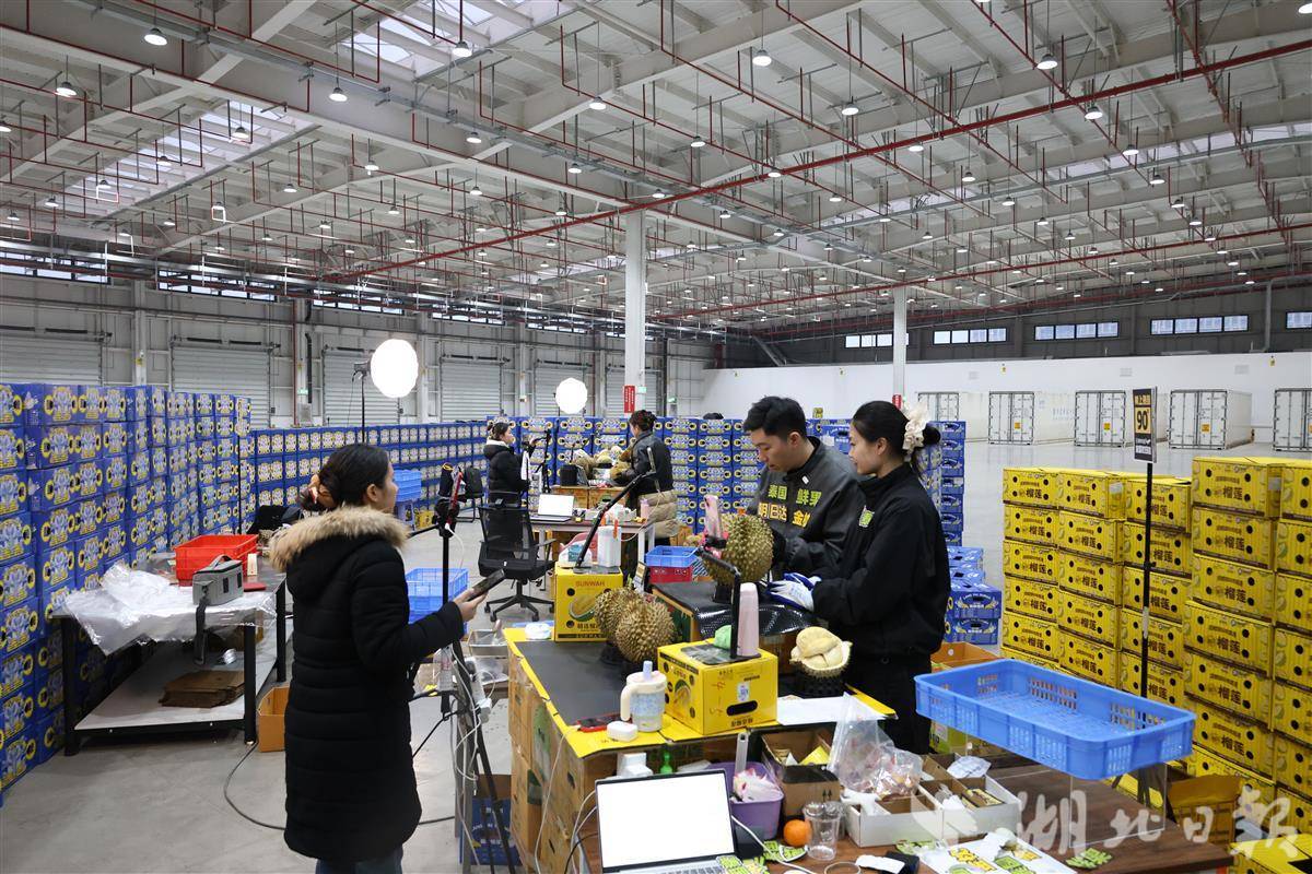 蛇年小年,鄂州的暮色渐浓,临空经济区空港保税物流中心(B型)的库房里却是一片热火朝天。大门推开,浓郁热烈的榴莲香扑面而来。叉车在“榴莲墙”间灵活穿梭,货架旁,四个透明的直播间灯火通明,年轻的主播们正对着镜头试吃、吆喝,一场从枝头到舌尖的“极速旅行”,每晚都在这里准时上演。