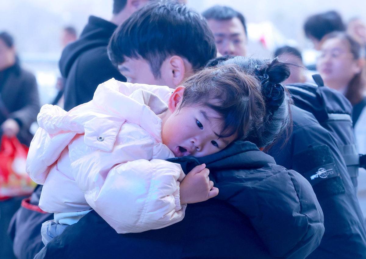 图为武汉站,一位小旅客跟着家人有序进站。