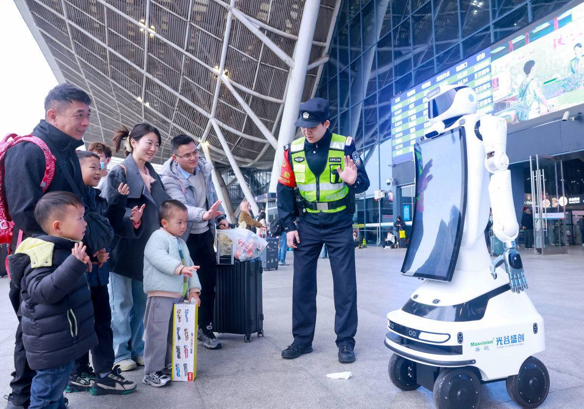 图为武汉站进站广场,旅客们和警用机器人互动。