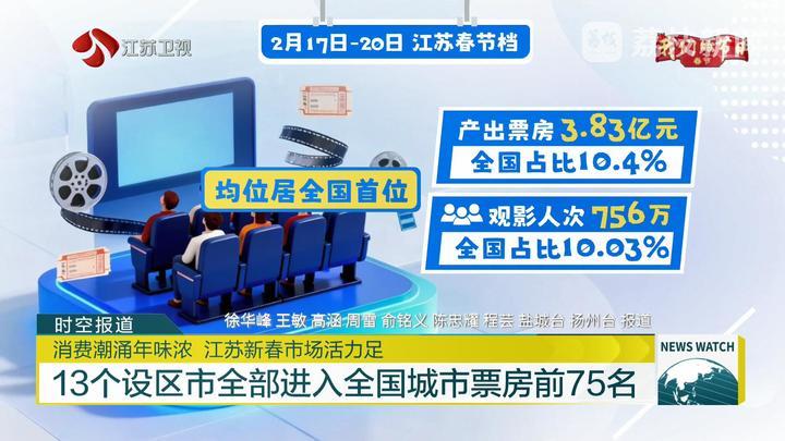电影票房是文化消费活力的风向标。截至目前,全国春节档电影总票房已突破40亿元。作为全国票仓,江苏电影市场持续领跑全国:2月17日至20日,江苏产出票房超3.83亿元,全国占比10.4%;观影人次超756万,全国占比10.03%,票房和人次均位居全国首位。放眼全国,江苏展现出“万马奔腾”的票房趋势,13个设区市全部进入全国城市票房前75名,苏州、南京、南通、无锡、盐城五市进入全国前20名。