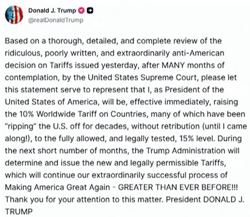 2月20日,美国最高法院裁定总统特朗普依《国际紧急经济权力法》实施的关税违法。特朗普随即援引《1974年贸易法》第122条,宣布对全球输美商品加征10%关税,为期150天。21日,他再将税率上调至 15%。