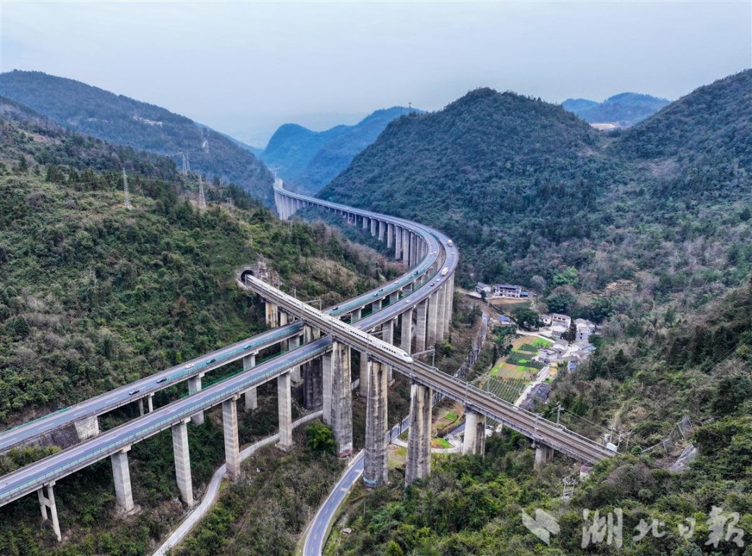 2月12日,恩施市白果乡桑树坝村,春运列车与汽车在层峦叠嶂间的公铁高架枢纽交汇,绘就出一幅山乡春运繁忙的画卷。(视界网 张远明 摄)
