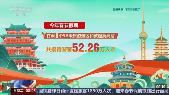 记者从甘肃省文旅厅了解到,今年春节假期全省8个5A级旅游景区和敦煌莫高窟共接待游客52.26万人次。交通出行热度持续攀升,国铁兰州局通报,昨天发送旅客42万人次‌,为春节假期最高峰。
