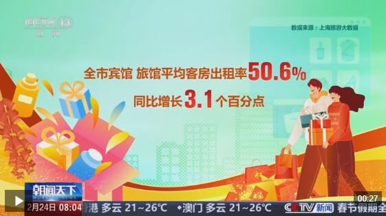据上海旅游大数据监测,今年春节假期,上海共接待游客2167.21万人次,同比增长8.36%;涵盖吃、住、行、游、购、娱等全要素的旅游消费交易总金额达256.14亿元,同比增长20.9%。全市宾馆、旅馆平均客房出租率为50.6%,同比增长3.1个百分点。