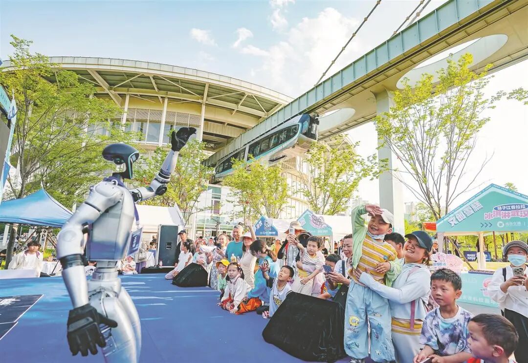 2025年5月1日,在武汉光谷空轨高新大道站,人形机器人与游客互动。(湖北日报全媒记者 魏铼 摄)