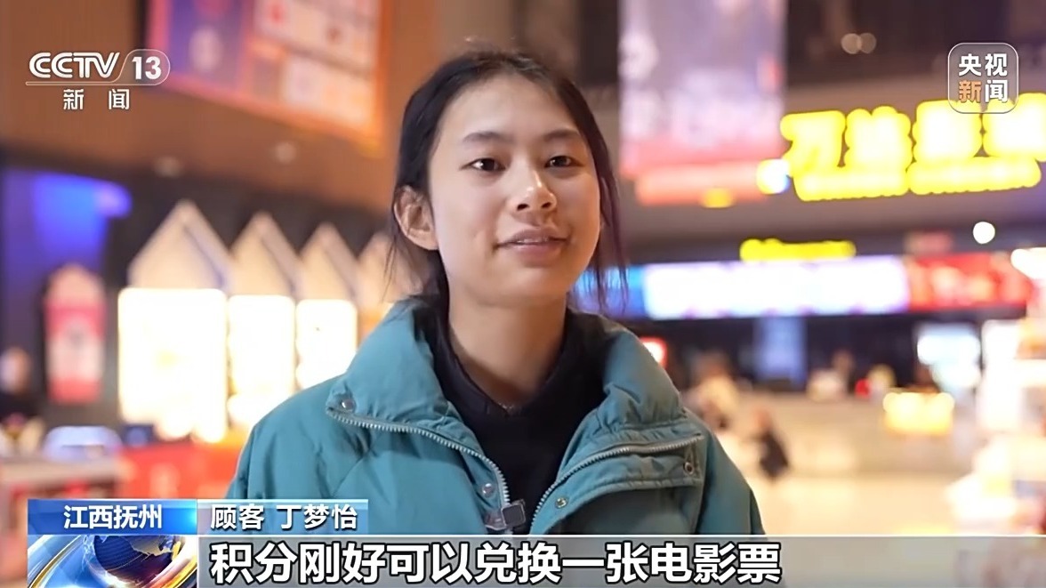 顾客 丁梦怡:今天和朋友在商场逛街、吃饭,积分刚好可以兑换一张电影票,就顺便来看场电影,感觉挺划算,也多了一种过年的娱乐方式。
