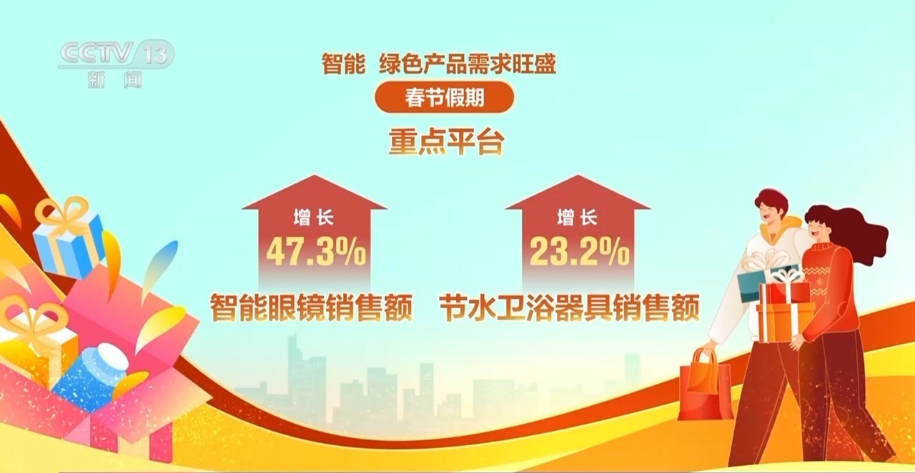 商务部数据显示,截至2月23日,2026年消费品以旧换新惠及3112.7万人次,带动销售额2070.3亿元。智能、绿色产品需求旺盛,春节假期,重点平台智能眼镜、节水卫浴器具销售额分别增长47.3%和23.2%。