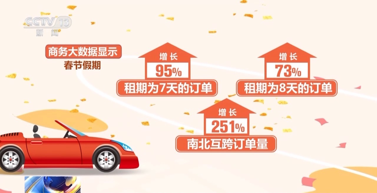 今年春节假期,新场景、新业态、新模式正在持续释放服务消费潜力。商务大数据显示,春节假期,重点平台租车出行订单量增长51%,其中租期为7天和8天的订单分别增长95%和73%,南北互跨订单量增长251%。