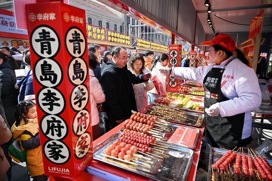 People buy candied fruits at a fair in Qingdao, east China's Shandong Province, Feb. 17, 2025. (Xinhua/Li Ziheng)■