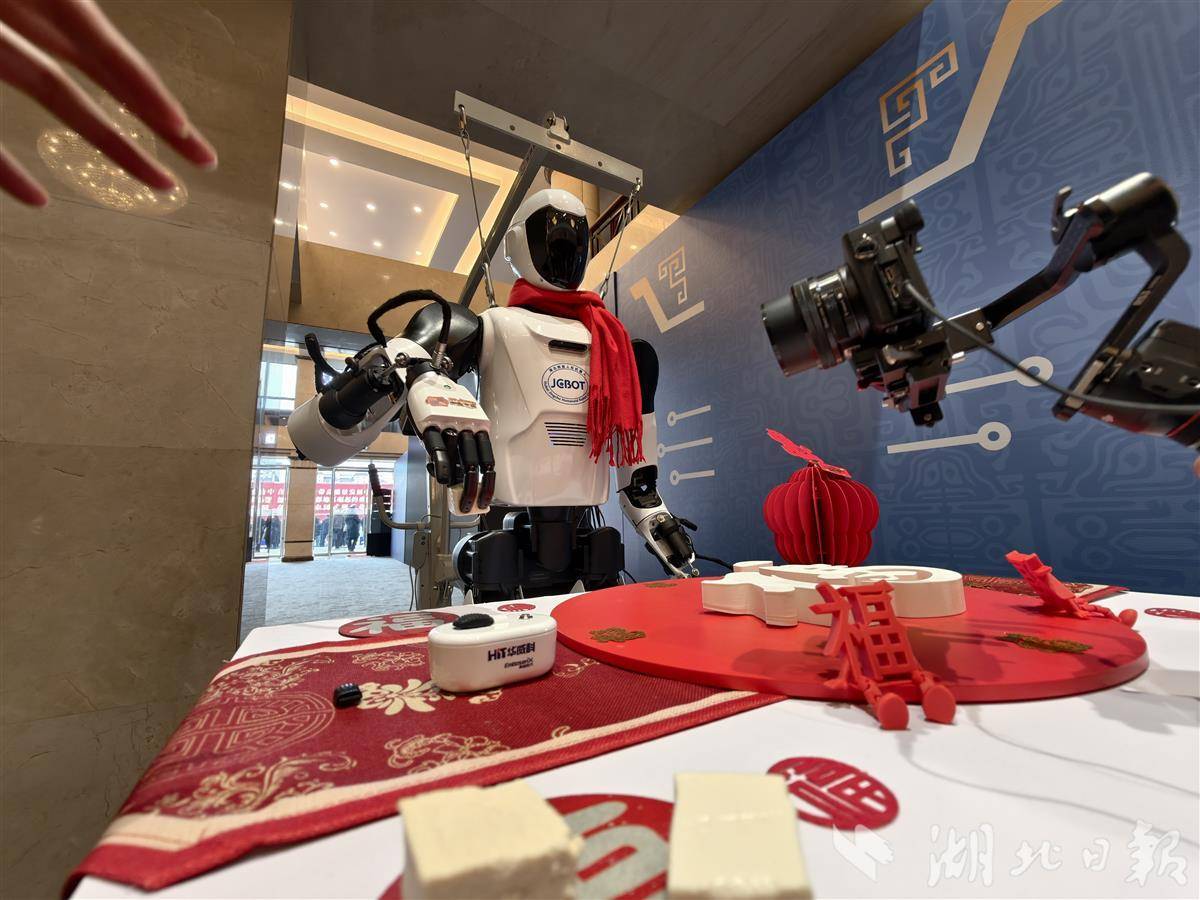 “荆楚”机器人轻轻拈起一块嫩豆腐,轻轻、稳稳地落在纸盘上,为“衣”字旁添上最后一笔,一个完整的“福”字,大功告成!