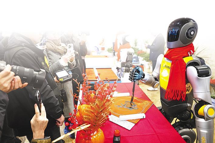 人形机器人进行书法表演。(新华社发)