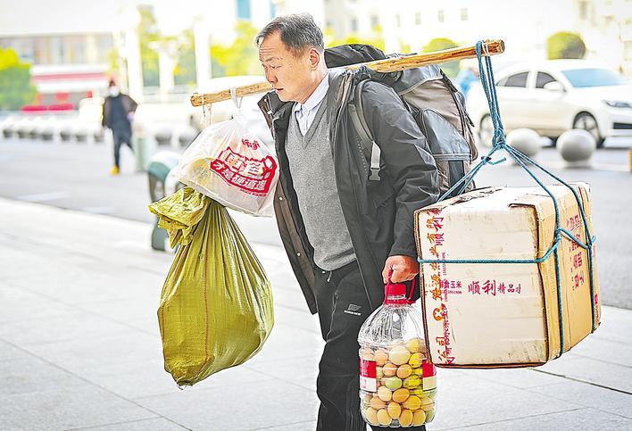 60岁的严先生肩负百斤土特产去厦门过年。 (湖北日报全媒记者 朱熙勇 摄)