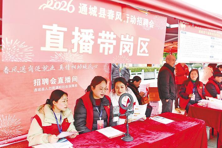 2月24日,在通城县“春风行动”大型招聘会上,工作人员直播带岗。 (视界网 刘建平 摄)
