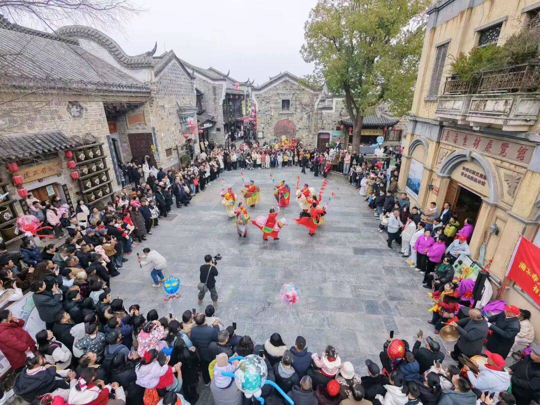 荆门明显陵文化旅游景区。莫愁村洋溢着浓厚的节日氛围,非遗民俗表演吸引众多游客围观。
