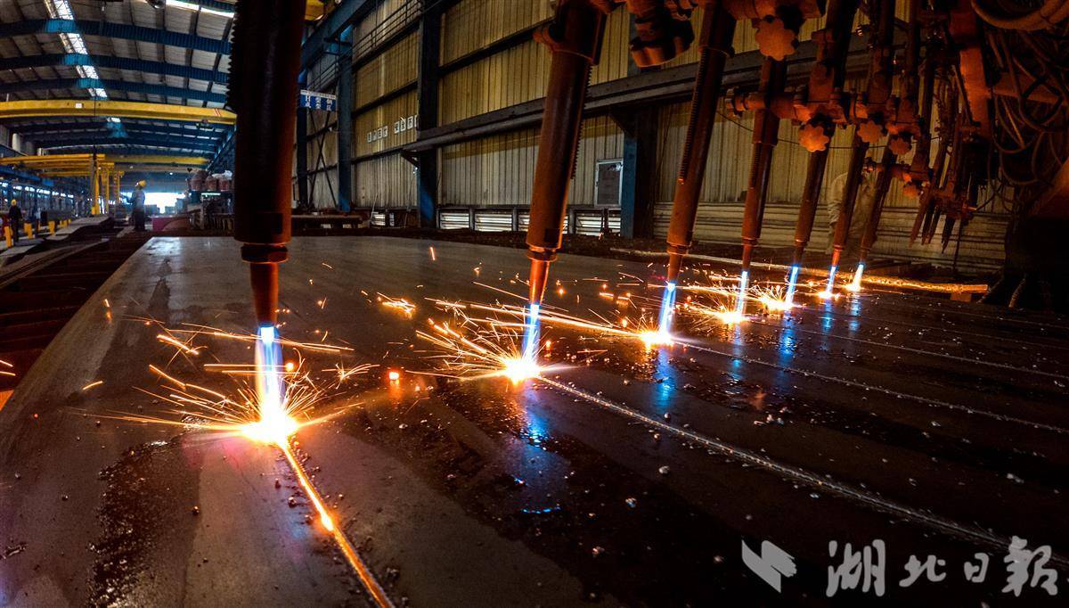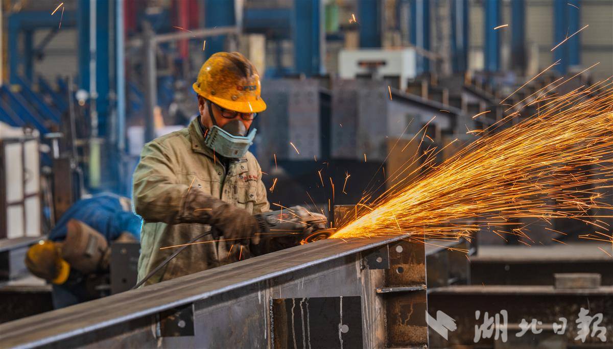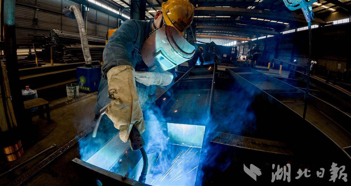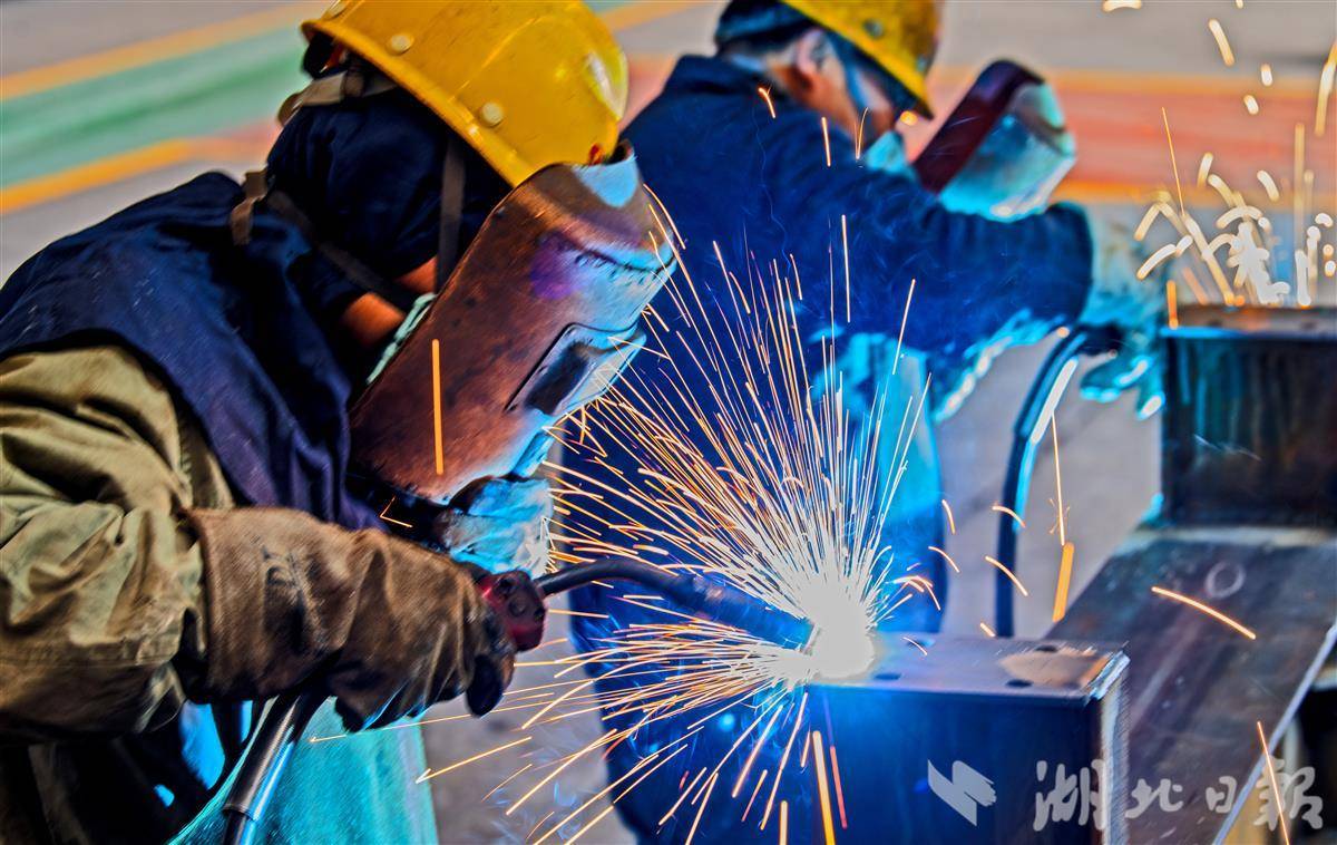 枝江湖北欧本钢结构有限公司车间内机器轰鸣、焊花飞溅,4条生产线开足马力,冲刺“开门红”。(湖北日报全媒记者 刘曙松 通讯员 胡波 田雪莲 摄)