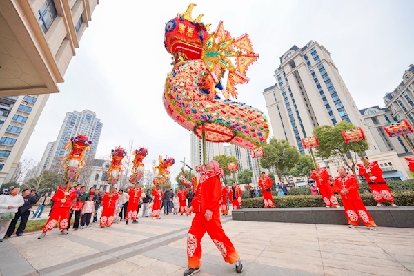 2月24日,武汉市汉阳区龙阳新村社区在龙阳街道文化广场举办马年春节舞龙表演活动, 伴随着铿锵有力的锣鼓声,高龙队队员们或头顶肩扛,或口衔齿托,表演叩龙、举龙、抖龙等高难度动作,高5米、重达30公斤的高龙上下翻飞,生动展现了非遗舞龙的独特魅力与文化底蕴。楚天都市报极目新闻记者宋枕涛 通讯员杨梅摄影报道