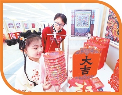 小朋友在北京奥运博物馆新春系列活动上观赏灯笼。陈晓根摄