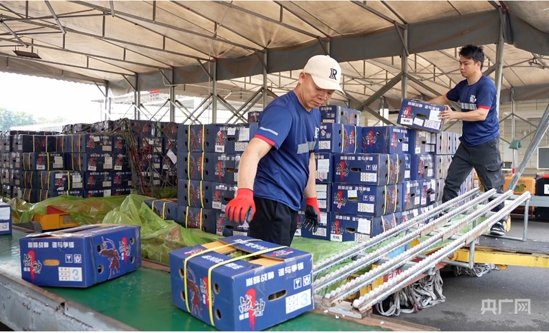在南宁吴圩国际机场货运站,工作人员将鲜榴莲卸下(央广网记者 梁瑜琳 摄)