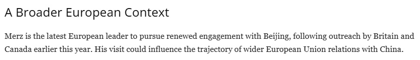 另外,从更广泛的背景来看,继英国和加拿大领导人今年早些时候访华之后,默茨成为最新一位访华的西方领导人。而此次访问可能会影响欧盟与中国关系的走向。