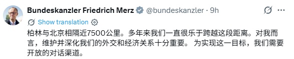 抵达北京后,默茨在社交媒体平台发文称:“柏林和北京相距近7500公里,多年来,我们非常高兴能够跨越这一距离。对我而言,维护和深化我们的外交与经济关系至关重要。为实现这一目标,我们需要畅通的对话渠道。德国正在寻求深化与中国关系的‘巨大机遇’。”