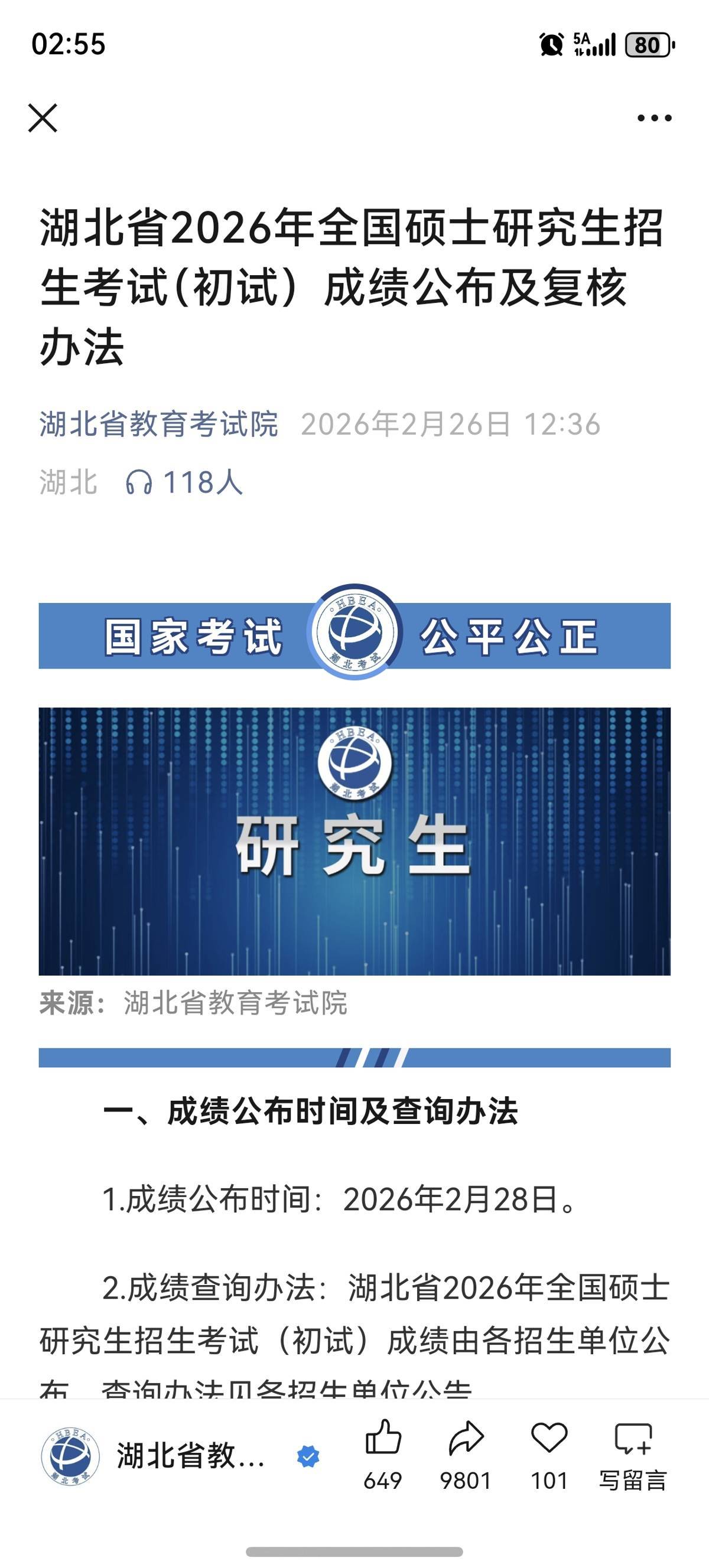湖北日报讯(记者包东喜、通讯员沈考)2月26日,湖北省教育考试院发布消息,湖北省2026年全国硕士研究生招生考试(初试)成绩将于2月28日公布。考生如对成绩有异议,可于3月1日-3日申请复核。