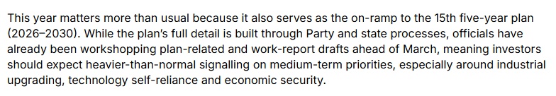 文章说,今年的两会尤为关键,将为第十五个五年规划(2026-2030年)奠定基础。投资者应关注比往年更明确的政策信号,特别是在产业升级、科技自主和经济安全等领域。