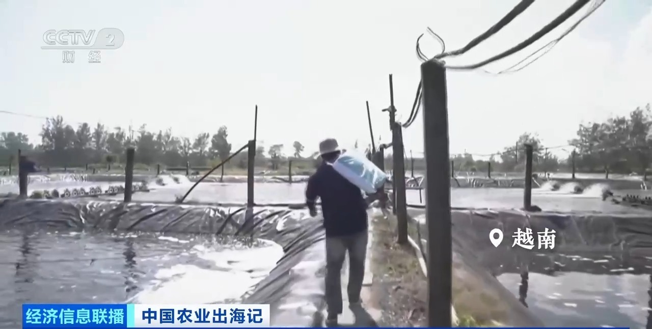 在越南的这处现代化养虾场,工人们正忙着投喂特种饲料。养殖户阿论说,这些饲料是中国企业生产的,在投料过程中,还会接受中国技术人员的指导。