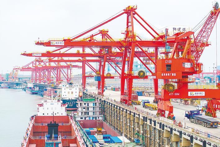 2月25日,武汉阳逻港国际集装箱码头迎来春节假期后的新一轮作业高峰,码头上一派繁忙景象。