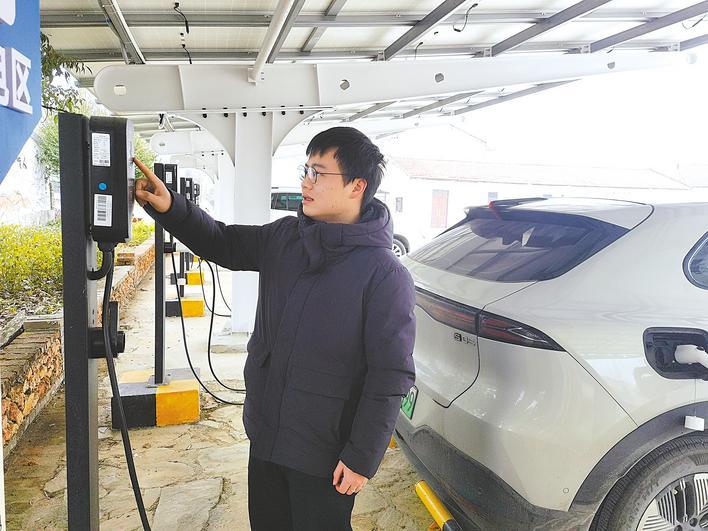 沿着蜿蜒的乡道来到青山村,一进村部,26岁的村党总支书记助理陈壮正在给爱车充电。顶棚下,布设了8个充电枪,顶棚上,是光伏板。“这里阳光充足,通过光伏板收集的绿电,再给充电桩供电,实现绿色循环。”青山村党总支书记张国勇介绍,通村公路不仅通村达户,而且提档升级,修成了5米多宽的双车道,近年来有100多户村民购买了新能源汽车,充电桩正串联起绿色出行的便捷通道。
