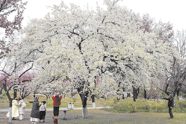 2月26日,江城春雨淅沥,武汉青山公园一棵树龄达58年、身高逾10米的老梨树,正值一年一度的盛花期。满树梨花晶莹如雪,层层叠叠,如云团般铺天盖地。尽管天空飘着小雨,但丝毫不减其绚烂。洁白的花朵缀满枝头,在雨丝浸润下更显清丽脱俗。游客们或驻足仰观,赞叹其壮观;或冒雨在树下拍照,记录下这“梨花带雨”的春日限定美景。这棵老树用它如云似雪的花海,在新春为人们带来了一场浪漫而充满生命力的视觉盛宴。