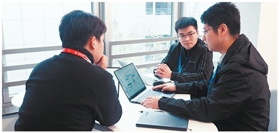 中移互联网的工作人员在讨论风控平台的识别策略。人民网记者 张若涵摄